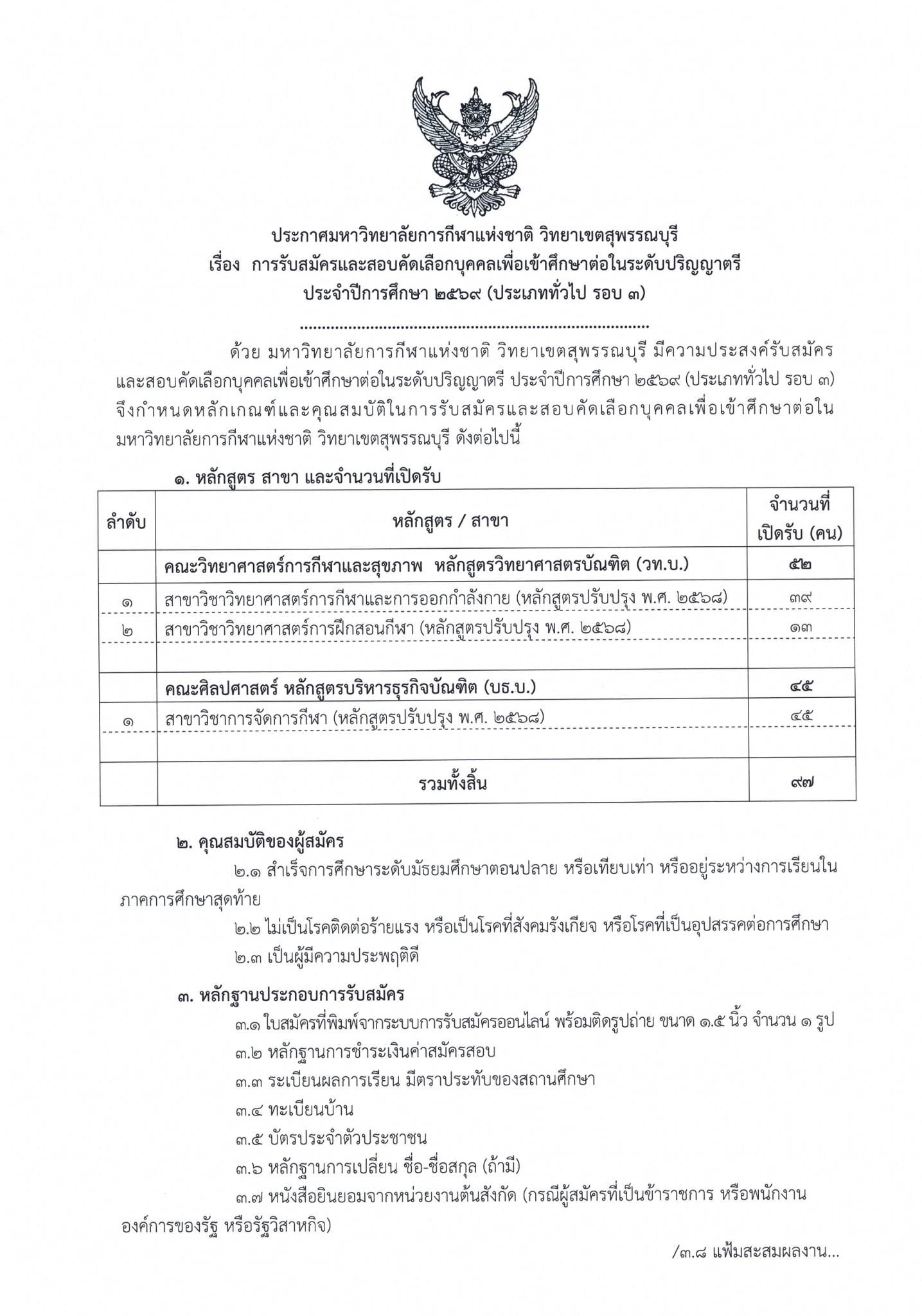 - ประกาศรายชื่อผู้ผ่านการสอบคัดเลือกบุคคลเข้าศึกษาต่อในมหาวิทยาลัยการกีฬาแห่งชาติ วิทยาเขตสุพรรณบุรี ระดับปริญญาตรี ประจำปีการศึกษา ๒๕๖๙ (ประเภททั่วไป)