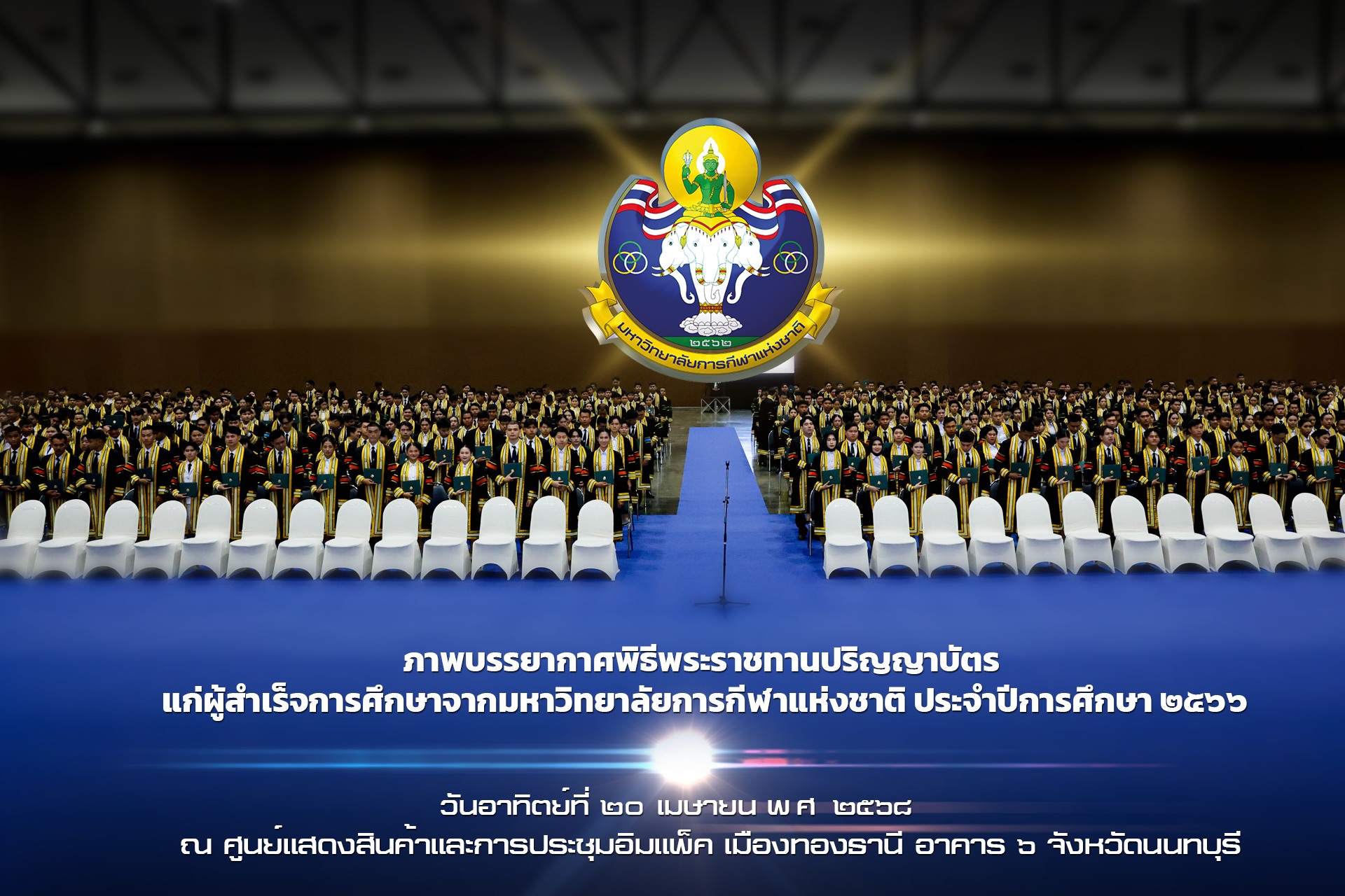 ภาพพิธีพระราชทานปริญญาบัตรแก่ผู้สำเร็จการศึกษาจากมหาวิทยาลัยการกีฬาแห่งชาติ ประจำปีการศึกษา 2566 ณ ศูนย์แสดงสินค้าและการประชุมอิมแพ็ค เมืองทองธานี อาคาร 6 จังหวัดนนทบุรี